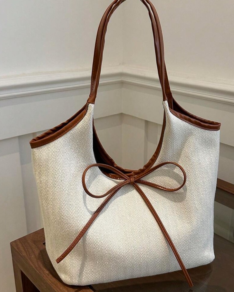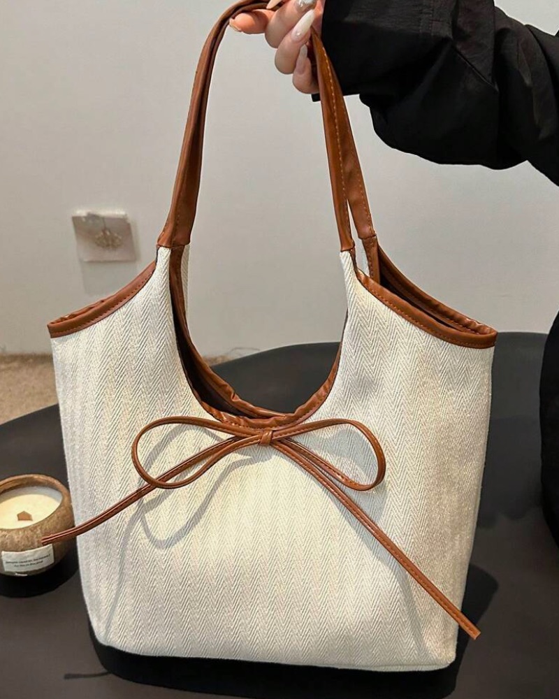 Κομψή τσάντα σε συνδυασμό μπεζ και καφέ, με ιδιαίτερο κόμπο στις λαβές. Ιδανική για city looks.